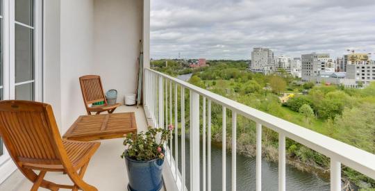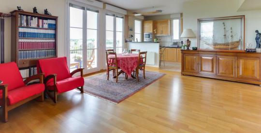La pièce de vie conviviale et ouverte accueille une cuisine aménagée et équipée prolongée par le séjour, donnant accès à une terrasse ainsi qu'à un balcon offrant une vue dégagée sur la Vilaine.