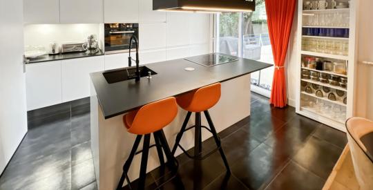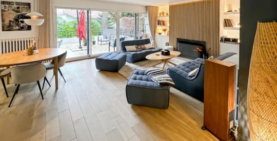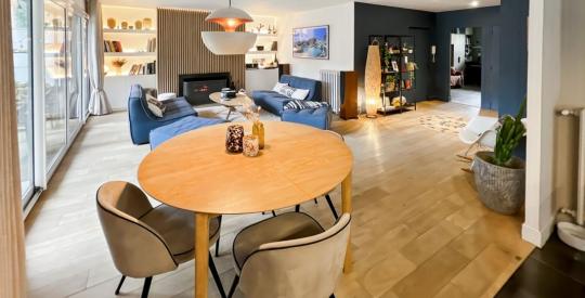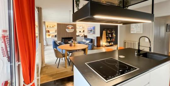 Séjour-salon lumineux avec cheminée et cuisine ouverte