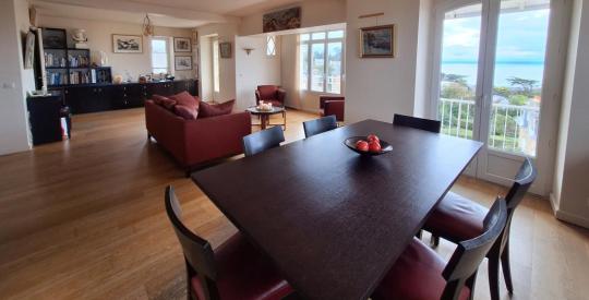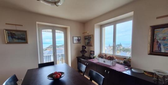 Vous trouverez au 1er niveau, un séjour lumineux avec vue mer et 2 balcons, une cuisine indépendante, un wc indépendant, un couloir desservant 1 chambre, 1 salle de bains avec wc, 1 salle d'eau, 1 bureau, et à l'étage, une belle pièce donnant accès à la terrasse avec une vue mer, un couloir équipé de rangements desservant 2 chambres et 1 salle d'eau avec wc. Au-dessus de l'entrée, un escalier en acier replié donne accès à un dernier espace sous faîtage qui peut -être un petit bureau. La rénovation (2000) a pris en compte l'acoustique et thermique de l'ensemble. Vous bénéficierez également d'une buanderie, une cave et une place de stationnement dans la cour.
