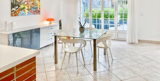 Le rez-de-chaussée offre un espace de vie rare, baigné de lumière, parfait pour recevoir ou profiter de moments en famille. La maison se prolonge vers l'extérieur par un jardin intimiste, idéal pour les repas d'été ou pour créer un espace de détente.