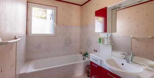 Une cuisine indépendante aménagée, deux chambres sur parquet, dont une donnant accès à la terrasse sur jardin, une salle de bain (douche et baignoire) et un WC.