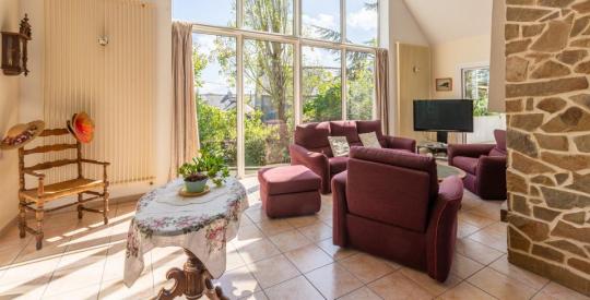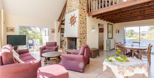 Passé l'entrée, vous découvrirez un majestueux salon avec plus de 6m de hauteur sous plafond et sa cheminée centrale en pierre, idéal pour les moments de partage et de convivialité.