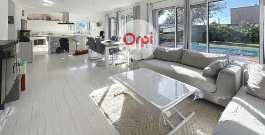 Entrée, WC, pièce de vie lumineuse exposée plein Sud donnant sur terrasse et piscine à l'abri des regard, suite parentale avec dressing et SDE-WC