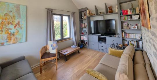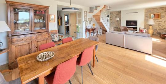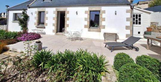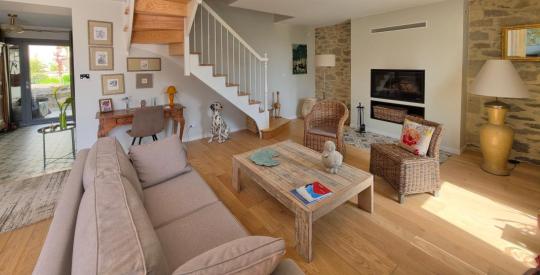 Découvrez un véritable coup de cœur sur l'Île Grande. Cette maison de 147 m², entièrement rénovée par des artisans locaux, conjugue à merveille le respect des matériaux anciens et un aménagement contemporain de qualité. La maison se compose comme suit au rez-de-chaussée : une entrée donnant sur un spacieux séjour/salle à manger exposé plein SUD. Vous trouverez également un salon (pouvant être utilisé comme chambre supplémentaire), une cuisine indépendante aménagée, une arrière-cuisine, des WC indépendants, et une suite parentale complète. À l'étage : Un palier desservant deux chambres lumineuses, une salle d'eau et des WC indépendants. L'entrée sous porche est un réel atout, idéal pour se déchausser confortablement après le tour de l'Île Grande.