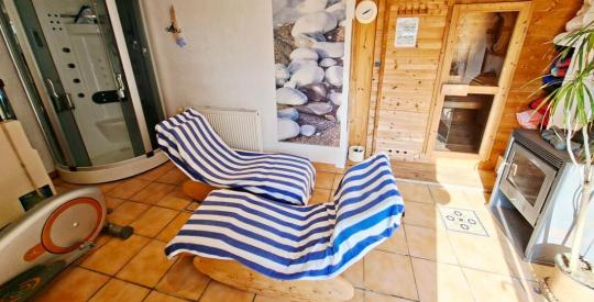 Un espace bien-être avec sauna, douche et poêle à bois vient compléter l'ensemble, invitant à prolonger les séjours, été comme hiver.