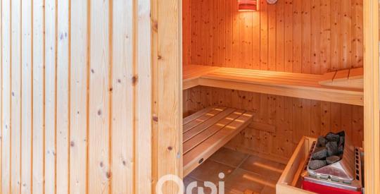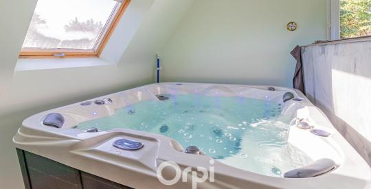 La spacieuse pièce de vie de 50m² s'ouvre sur la terrasse et le jardin, tandis que la cuisine attenante favorise les moments conviviaux. La maison dispose de cinq chambres, dont une suite parentale de plain-pied, ainsi que d'une salle TV indépendante et d'un espace bien-être avec sauna et jacuzzi. Les équipements modernes, la domotique et le DPE classé C assurent un confort optimal. Vous bénéficiez également de la domotique, de l'aspiration centralisée et de nombreux rangements.