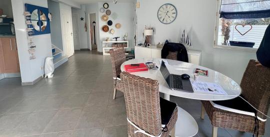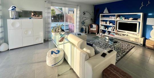 Dès les premiers pas, la maison révèle un espace de vie généreux et baigné de lumière, où le séjour s'ouvre harmonieusement sur une cuisine semi-ouverte, pensée pour les moments de partage. Les larges ouvertures prolongent naturellement la pièce vers une terrasse élégante avec piscine, véritable lieu de détente et de convivialité, idéal pour savourer les longues soirées estivales.