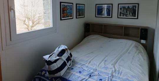 L'entrée dessert une chambre double accueillante, une cabine fonctionnelle, un WC indépendant, puis s'ouvre sur une pièce de vie baignée de lumière.