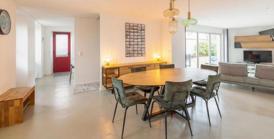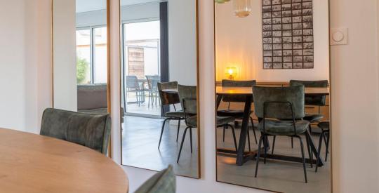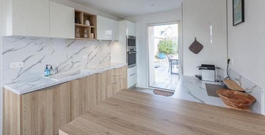 Le rez-de-chaussée dévoile une cuisine dinatoire, aménagée et équipée, pensée pour le confort et la convivialité, ouvrant sur un séjour chaleureux et un salon baigné de lumière, aux volumes agréables avec un accès direct à la terrasse exposée Sud/Ouest et son jardin paysagé clos.
