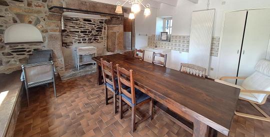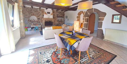La maison principale développe environ 188 m² habitables, dans une atmosphère chaleureuse et authentique. Dès l'entrée, la vaste pièce de vie de 52 m² séduit par ses volumes généreux et sa superbe cheminée en granit, témoin du caractère noble de la bâtisse.