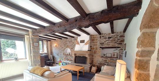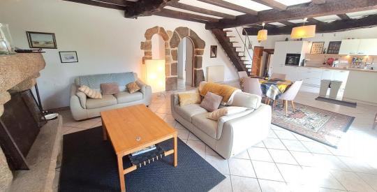 La maison principale développe environ 188 m² habitables, dans une atmosphère chaleureuse et authentique. Dès l'entrée, la vaste pièce de vie de 52 m² séduit par ses volumes généreux et sa superbe cheminée en granit, témoin du caractère noble de la bâtisse.