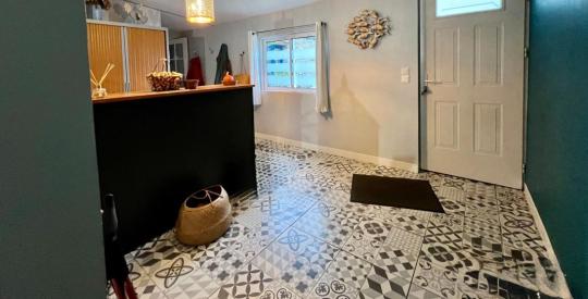 au RDC : un accueil , une cuisine , une grande buanderie avec un espace de rangement, une arrière cuisine ainsi qu'une grande salle de réception, idéale pour développer une activité de tables d'hôtes, organiser des événements privés ou proposer des repas aux voyageurs,
