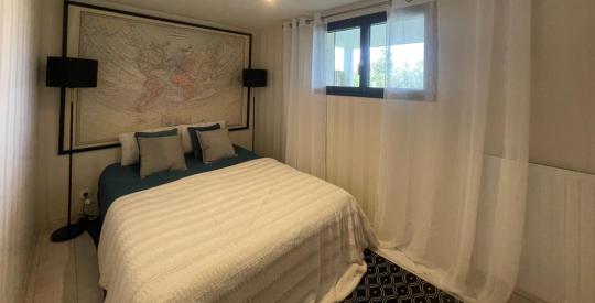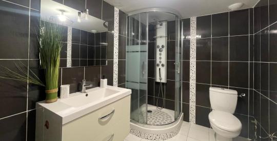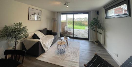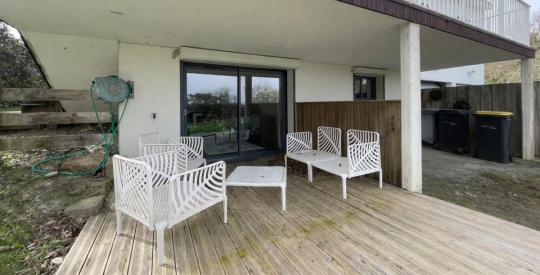 Elle se compose, en rez de jardin, d'un studio indépendant de type T2 offrant une cuisine équipée et aménagée, une pièce de vie donnant sur une terrasse, une chambre et salle d'eau avec WC. Un double garage et une buanderie complètent ce niveau.