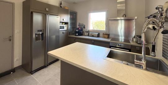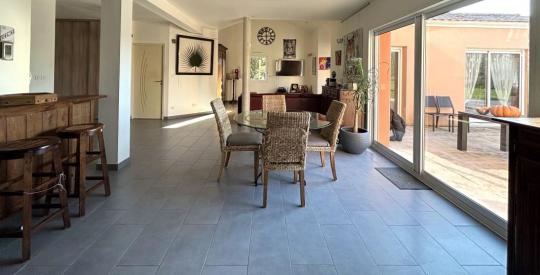Elle est composée, au rez-de-chaussée, d'une entrée avec placard donnant sur un grand salon séjour de 58 m2, une cuisine (Schmidt) aménagée et équipée, une buanderie, une chambre de plus de 20 m2, un bureau, ainsi qu'une suite parentale de 19 m2.