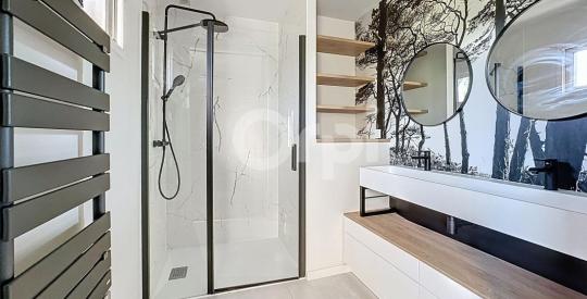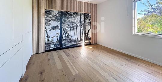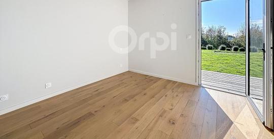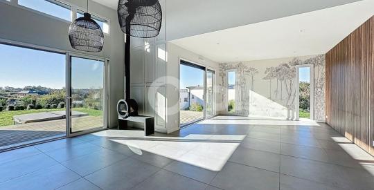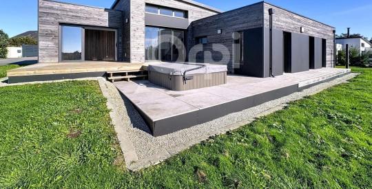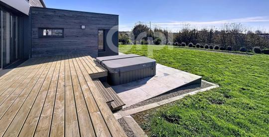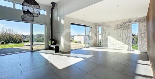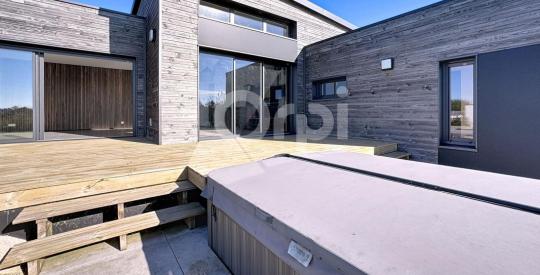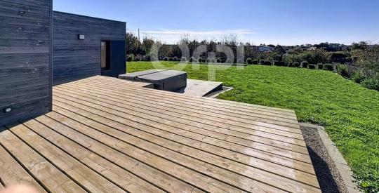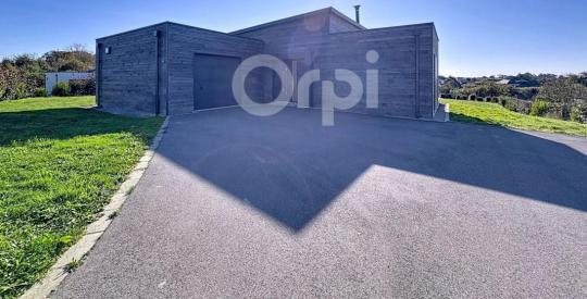 Située au calme, en fond d'impasse, cette maison contemporaine en ossature bois, construite en 2022, bénéficie d'une belle vue dégagée sur la mer.