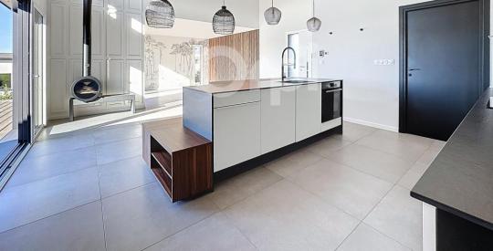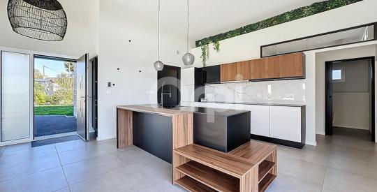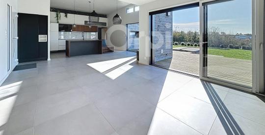 La pièce de vie, baignée de lumière, s'ouvre sur une cuisine moderne et entièrement équipée, prolongée par un cellier.