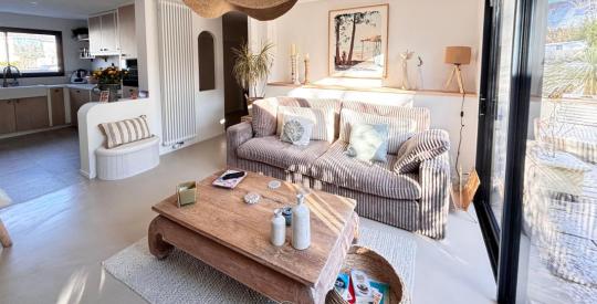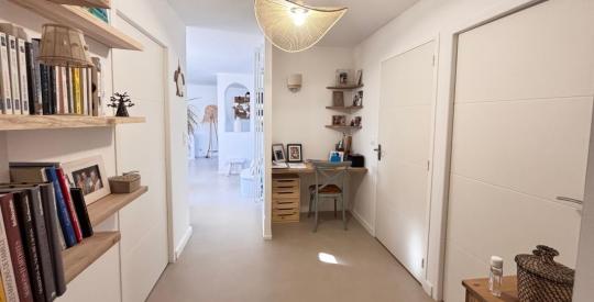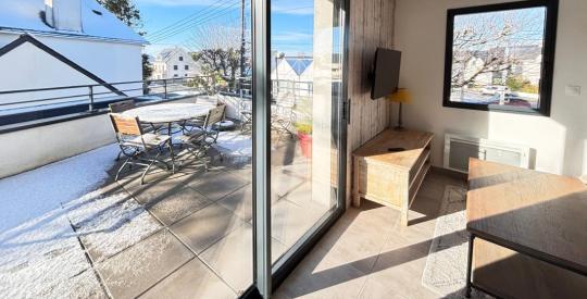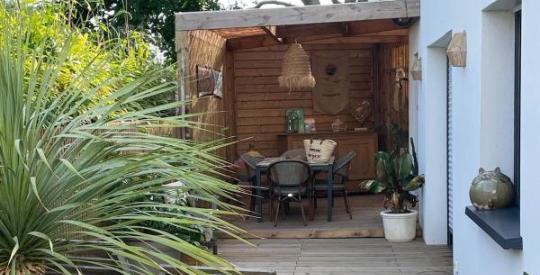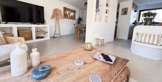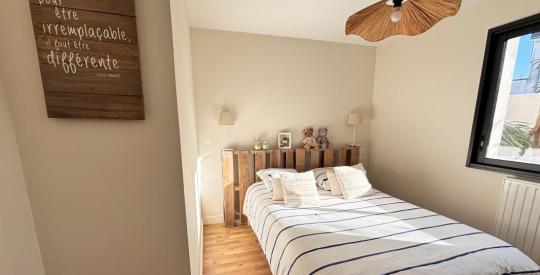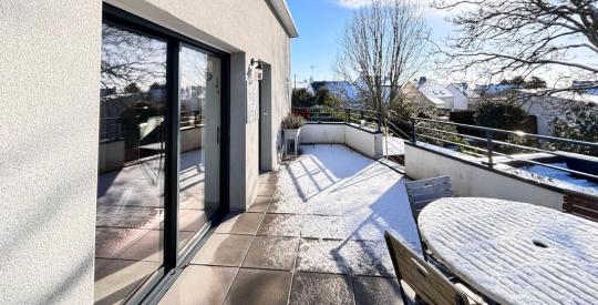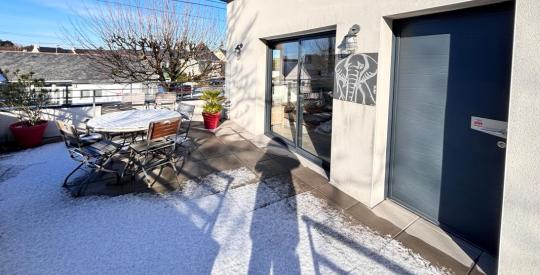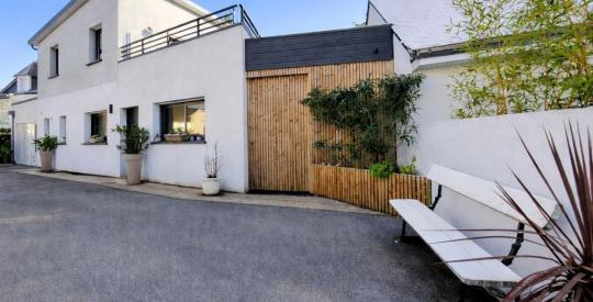 Dans le centre ville de Guérande, à 400 mètres des remparts, proche de toutes les commodités (boulangerie, coiffeur, boucher, pharmacie, professions médicales), ensemble immobilier sous forme de maison contemporaine récente composé au rez-de-chaussée d'un logement d'environ 110 m2 récemment rénové dans le style wabi-sabi avec une entrée, un séjour-salon donnant sur terrasse exposée sud, une cuisine neuve entièrement aménagée et équipée, une salle d'eau, une chambre, un wc visiteur, une buanderie et une suite parentale d'environ 25 m2 avec dressing, salle d'eau et WC. Une terrasse avec une pergola et un coin salon complète ce niveau.
