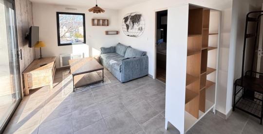 A l'étage un appartement d'environ 46 M2 composé d'une pièce de vie avec cuisine équipée et aménagée , une chambre, un wc indépendant et une salle d'eau. Une grande terrasse exposée sud ouest et un carport fermé complètent ce bien.