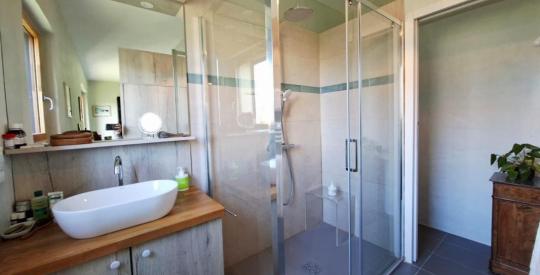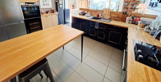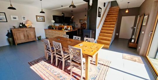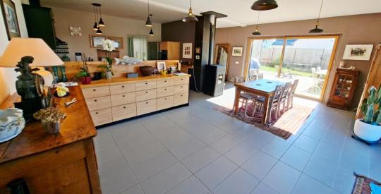 Le rez-de-chaussée s'organise autour d'une cuisine / salle à manger de 45 m², conviviale et chaleureuse, chauffée par un poêle à granulés (marque Rika / Asgard). Vous disposez également d'un salon de 25 m², d'une arrière-cuisine très pratique au quotidien, d'une suite parentale de 24 m², ainsi que d'une salle d'eau indépendante avec WC.