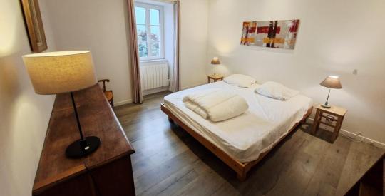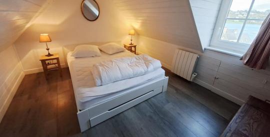 Au-dessus de la cuisine, une charmante chambre mansardée ajoute une note cosy et intimiste.
