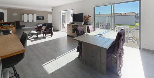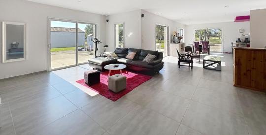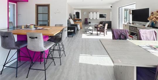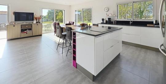 Elle offre une entrée, une vaste pièce de vie avec cuisine ouverte aménagée et équipée, une buanderie, une suite parentale avec salle d'eau, dressing et WC, ainsi que 4 chambres, 1 salle d'eau, 1 salle de bain et un cellier.