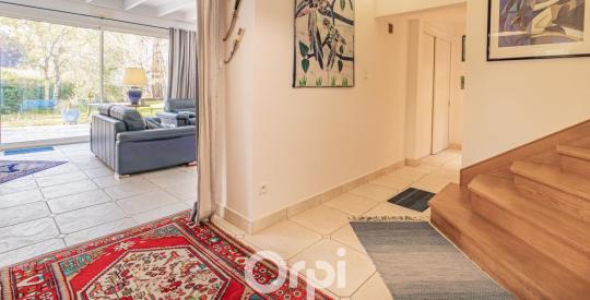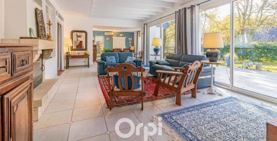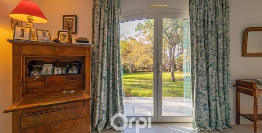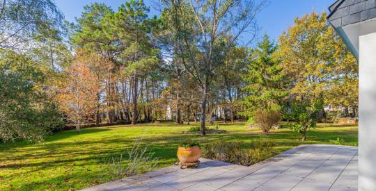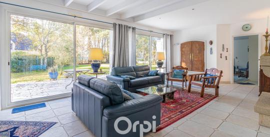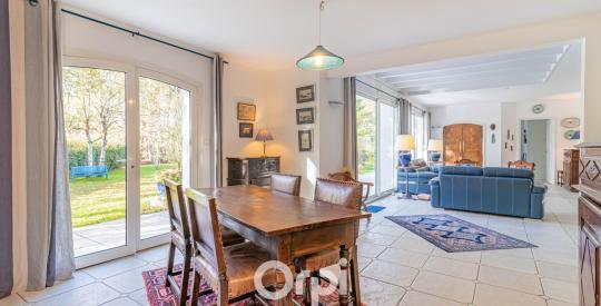 Dès l'entrée, la douceur des volumes et la luminosité omniprésente séduisent. Le vaste séjour, baigné de lumière grâce à de larges baies vitrées, s'ouvre sur une terrasse et un jardin arboré de plus de 4000 m².