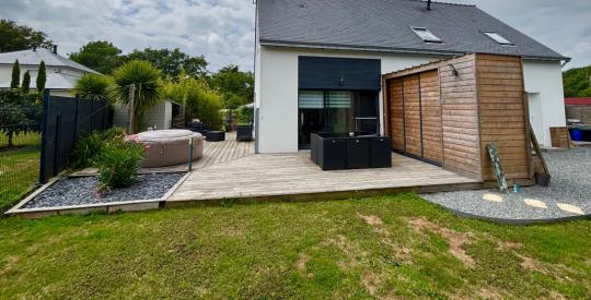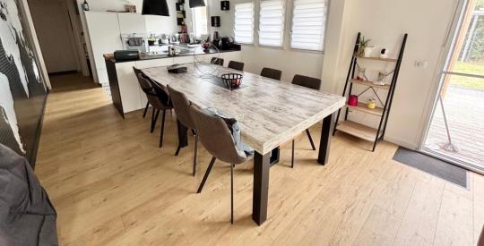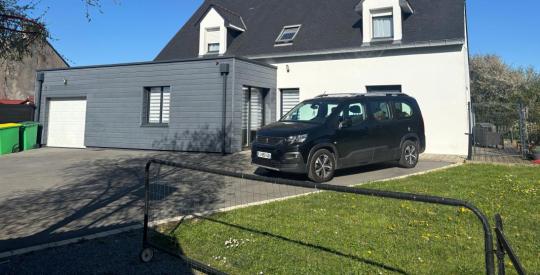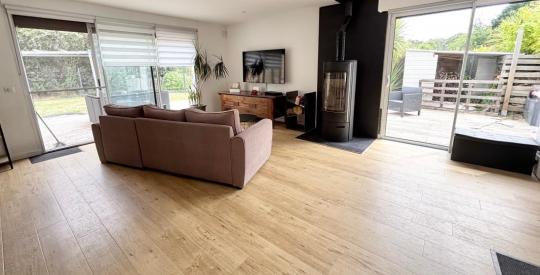Au calme en campagne, maison récente offrant salon- séjour exposé sud avec poêle à bois, cuisine aménagée et équipée, 5 chambres dont une spacieuse en rdc. Garage. Terrain de 1100m² avec terrasse exposée sud.