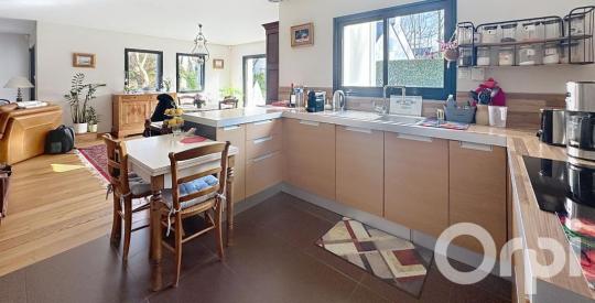 Dès l'entrée, vous serez séduit par sa magnifique pièce de vie de 60 m², baignée de lumière grâce à ses larges ouvertures sur le jardin. L'espace salon, chaleureux et convivial, est agrémenté d'un poêle à bois, parfait pour créer une atmosphère cosy en toute saison. La cuisine ouverte prolonge harmonieusement cet espace de réception généreux, idéal pour recevoir famille et amis.