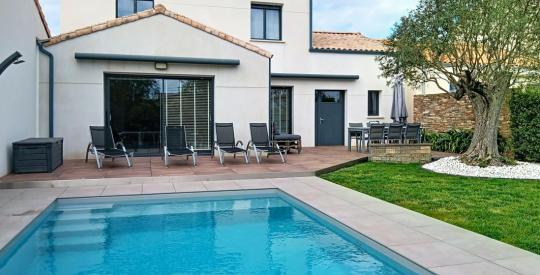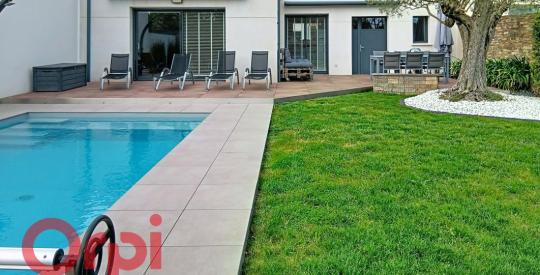 Maison récente dans le bourg D'OLONNE SUR MER, 3 chambres dont une suite parentale au rez de chaussée, bureau, 2 salles d'eau, 2 wc, séjour salon ouvert sur cuisine équipée aménagée, garage carrelé de 25 m² avec galta ,piscine chauffée (pompe à chaleur), sur une parcelle de 409 m², orientation sud. Proche des commerces et de la mer. Lumineux, sans vis à vis, VOUS POSEZ VOS VALISES.