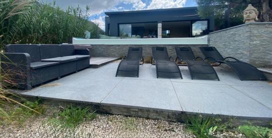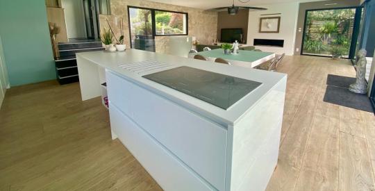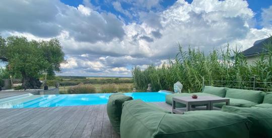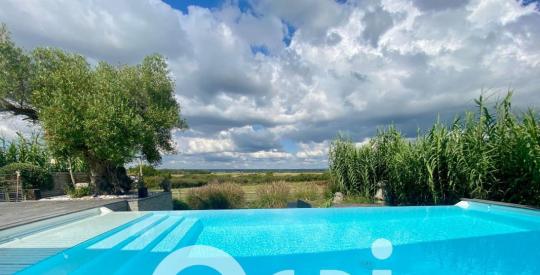 La maison comprend deux chambres spacieuses avec suite privative, un salon lumineux et une cuisine moderne. Profitez de moments de détente sur la grande terrasse avec une piscine à débordement, idéale pour les journées ensoleillées.