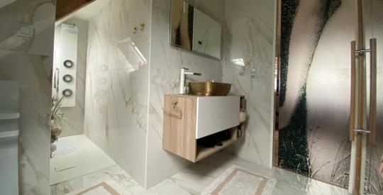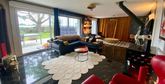 Séné - Vue mer imprenable pour cette maison de 1976 rénovée en 2017. Installée sur une parcelle de 1700 m2, exposée plein sud, cette maison de 140 m2 (214 m² possible au total avec la dépendance de 4 pièces)a été totalement transformée par les propriétaires actuels qui ont mit leur touche personnelle sur la décoration avec des matériaux qualitatifs.