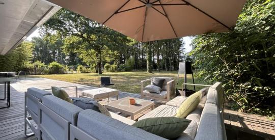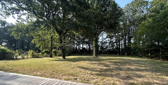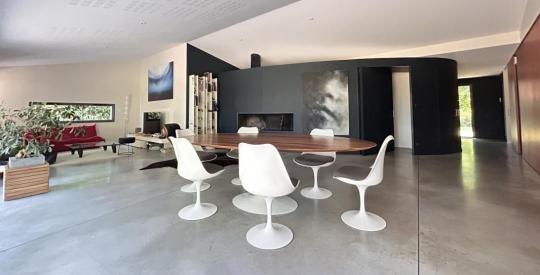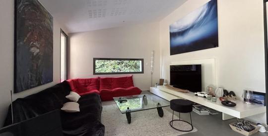 Cette maison se compose d'une spacieuse pièce de vie avec un plafond cathédrale et de grandes baies vitrées donnant sur la terrasse bois et le jardin piscinable.