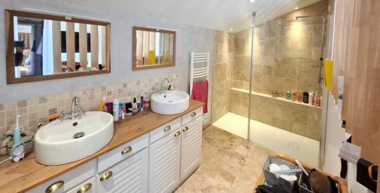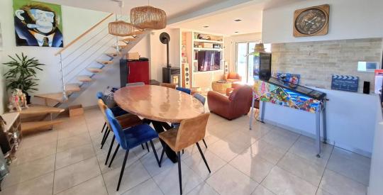Maison rare sur le secteur par la grande qualité de ses prestations. Récemment rénovée elle comprend au rez-de-chaussée : une belle pièce de vie, une cuisine aménagée et équipée par des éléments haut de gamme, une buanderie, un wc et une suite parentale avec dressing et salle d'eau. A l'étage, une grande mezzanine, pouvant servir de bureau ou coin nuit supplémentaire, donne accès à une salle de bains, un wc et deux belles chambres. En terme de confort de vie, vous bénéficierez d'un chauffage au sol au rez-de-chaussée et d'un poêle à pellets. Parmi les autres équipements, on retrouve notamment une surveillance vidéo de la maison, un système de domotique performant et un robot pour l'entretien du jardin.
