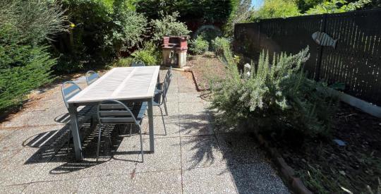 Deux terrasses dont une grande tout le long de la maison exposée sud côté jardin, avec un banne récente, un barbecue. Travaux de rafraichissement à faire.