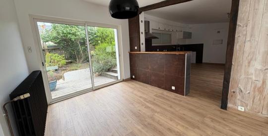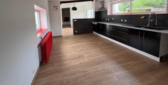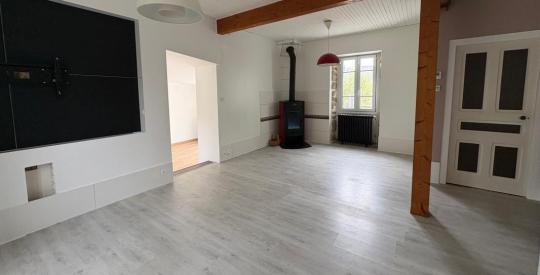 Au rez-de-chaussée d'une entrée, un grand salon-séjour avec poêle à bois ouvert sur la cuisine ouverte aménagée/équipée et une grande chambre.
