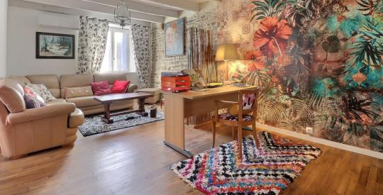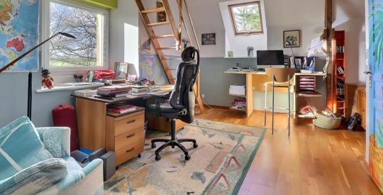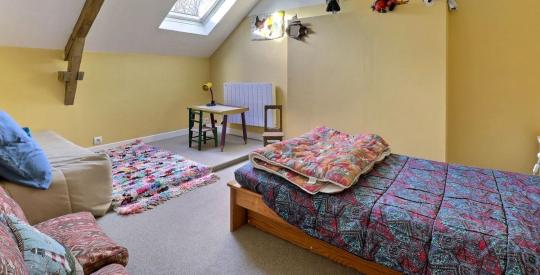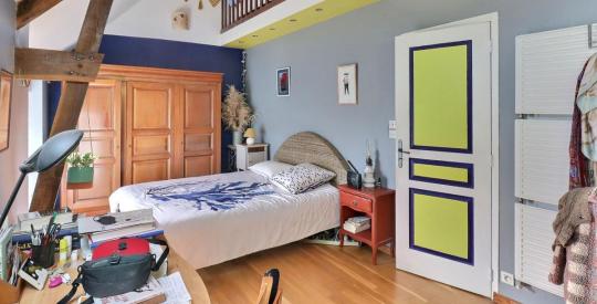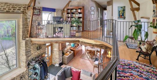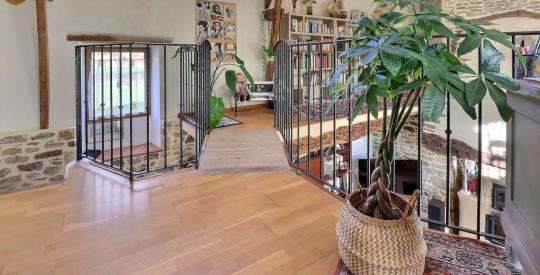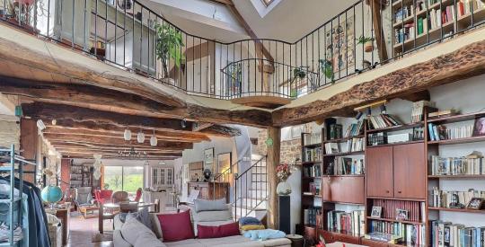 À l'étage, la mezzanine pleine de caractère accueille un espace bureau et une chambre avec dressing (possibilité de création d'une pièce d'eau). Vous trouverez également un WC indépendant, une salle de bain et deux grandes chambres bénéficiant chacune d'espaces en mezzanine, renforçant le charme atypique du bien.