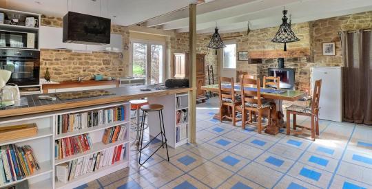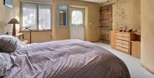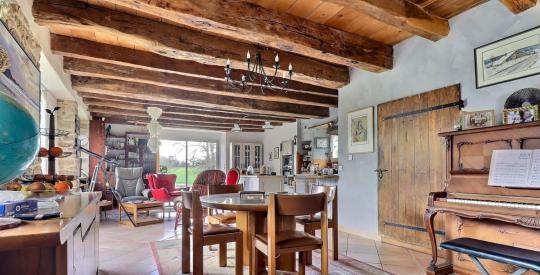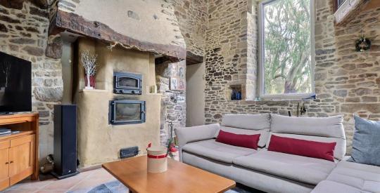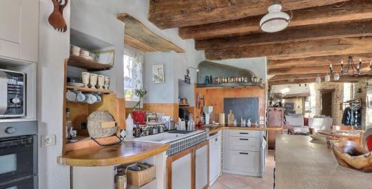 La maison principale (photos 4 à 13), exposée Sud-Ouest, développe environ 200 m² Loi Carrez (230 m² utiles). Baignée de lumière, elle séduit immédiatement par ses murs en pierre apparente aux joints à la chaux (maison saine, murs respirants, aucune humidité), ses poutres massives et ses volumes généreux. La grande pièce de vie, spectaculaire par sa hauteur sous plafond et sa mezzanine avec passerelle en bois, est sublimée par un poêle de masse et un chauffage au sol alimenté par pompe à chaleur au rez-de-chaussée (radiateurs à l'étage). L'ensemble offre une atmosphère chaleureuse et authentique, mêlant confort moderne et charme de l'ancien. La cuisine conviviale et équipée est complétée par une arrière-cuisine fonctionnelle. La vie de plain-pied est parfaitement possible grâce à une chambre située au rez-de-chaussée disposant de sa salle de douche privative avec douche à l'italienne, ainsi qu'un WC indépendant.