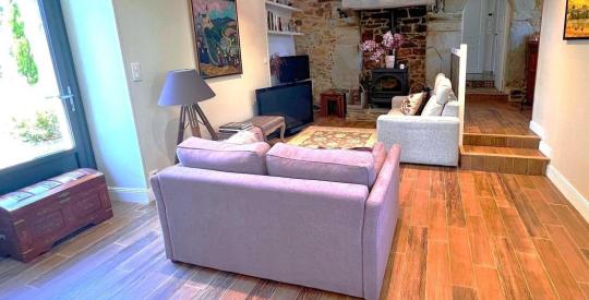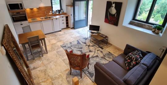 Le gîte attenant, véritable plus pour accueillir ou générer un revenu saisonnier, comprend une pièce de vie avec cuisine au rez-de-chaussée, et à l'étage une chambre avec salle d'eau et WC indépendant.