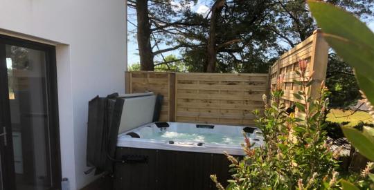 Une terrasse en bois avec jacuzzi vous permettra de savourer des moments de détente en toute tranquillité.