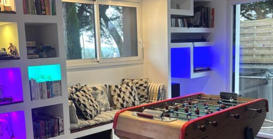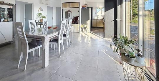 Dès l'entrée, la maison dévoile de magnifiques volumes baignés de lumière grâce à ses grandes baies vitrées orientées plein Sud, créant une atmosphère chaleureuse et conviviale.