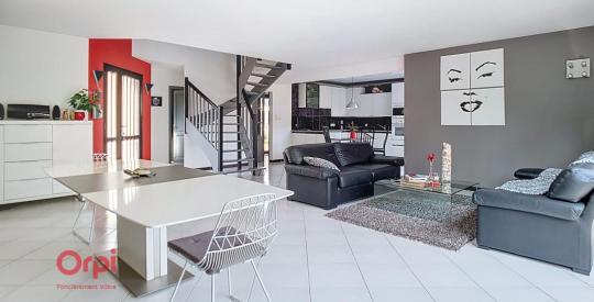 Dès l'entrée, vous serez séduits par une vaste pièce de vie lumineuse offrant de beaux volumes. La cuisine ouverte s'intègre naturellement à cet espace convivial et se prolonge vers l'extérieur, où vous profitez d'une superbe terrasse de 64 m², idéale pour les repas en famille, les moments de détente ou les soirées entre amis.