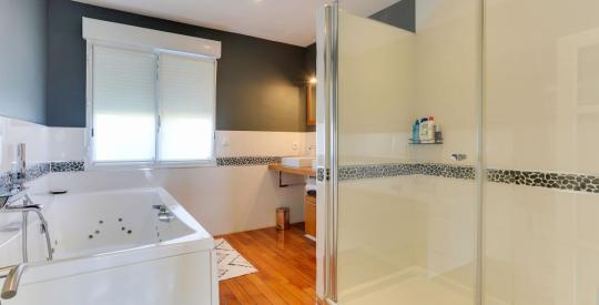 A l'étage, vous disposez de deux suites parentales avec salle de bains/eau privatives avec dressing, une chambre avec placards, un bureau, une salle d'eau et WC séparés.