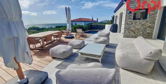 À l'extérieur, le jardin paysager vous invite à profiter d'une piscine étincelante, parfaite pour vous rafraîchir lors des chaudes journées d'été tout en admirant la vue panoramique sur la mer. Un garage spacieux complète cette demeure, offrant espace et commodités.